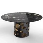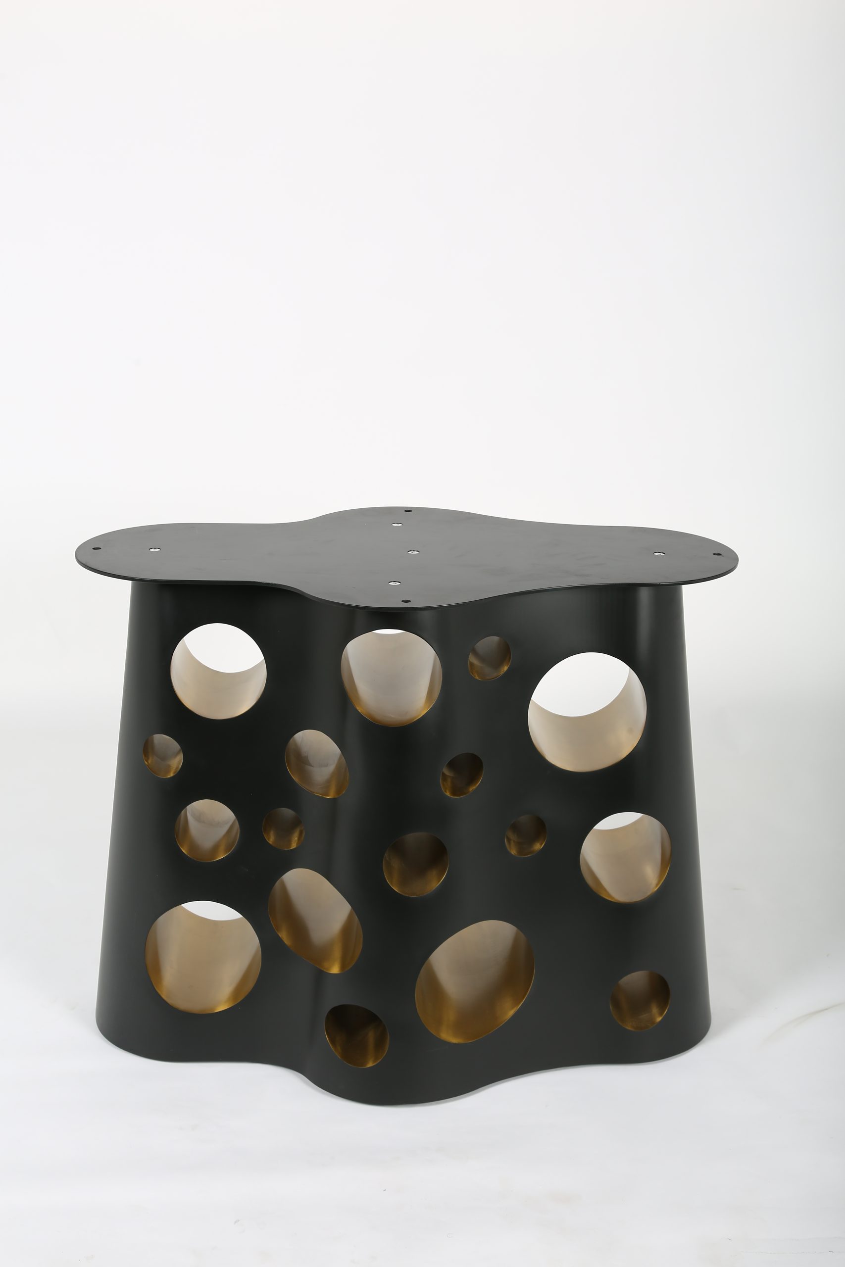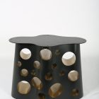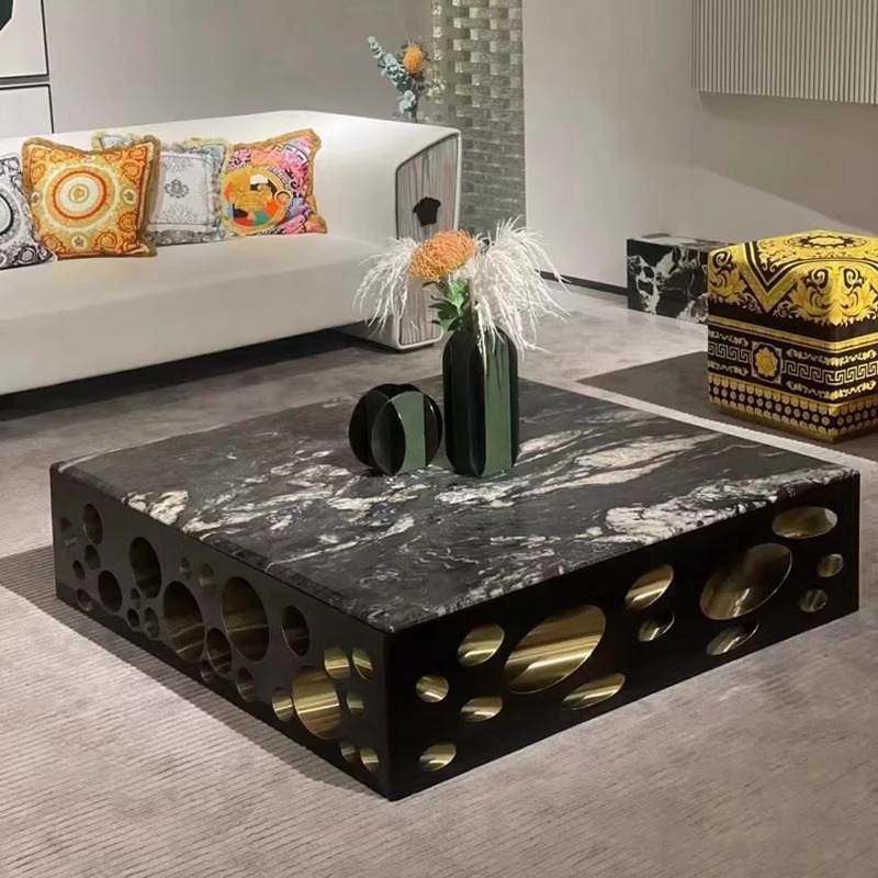 Its base, crafted from stainless steel finished in black and gold, features irregular circular openings that recall the texture of Swiss cheese — a bold creative detail that gives the table its name. The smooth natural marble top rests gracefully above, adding an element of timeless refinement to its avant-garde structure.