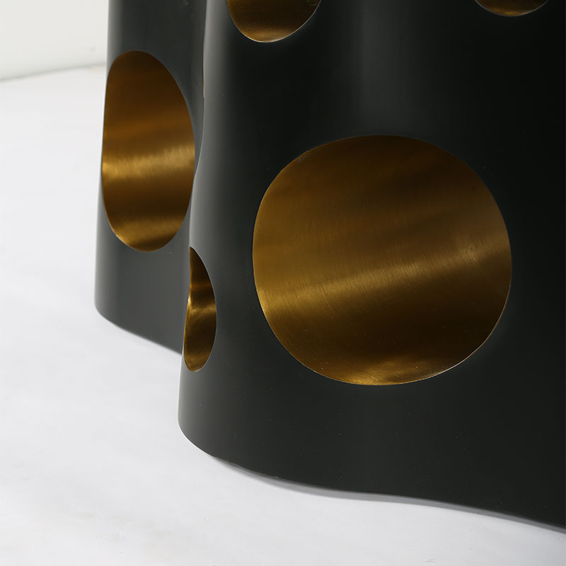 Each detail reflects precision and artistry. The polished marble top reveals natural veining unique to every piece, while the two-tone metal base glows with a soft golden warmth inside each cutout, creating a dynamic interplay of light and shadow.