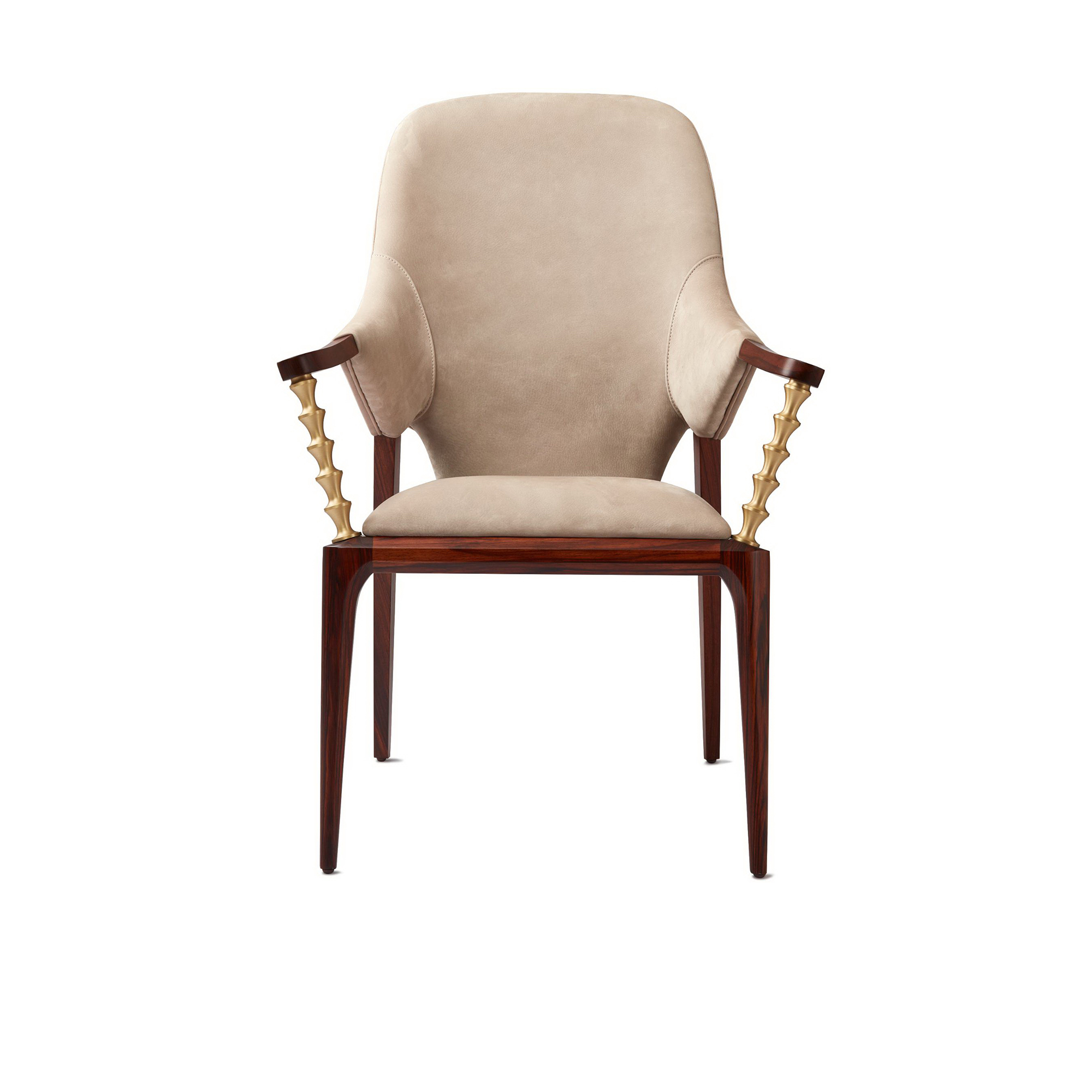 What truly distinguishes this chair is its remarkable arm design. The sculptural brushed brass elements feature a distinctive hourglass silhouette with multiple turned segments, creating a striking visual rhythm that catches and reflects light beautifully. These brass supports seamlessly connect the rich mahogany-stained wooden armrests to the frame, demonstrating exceptional attention to detail and superior craftsmanship.