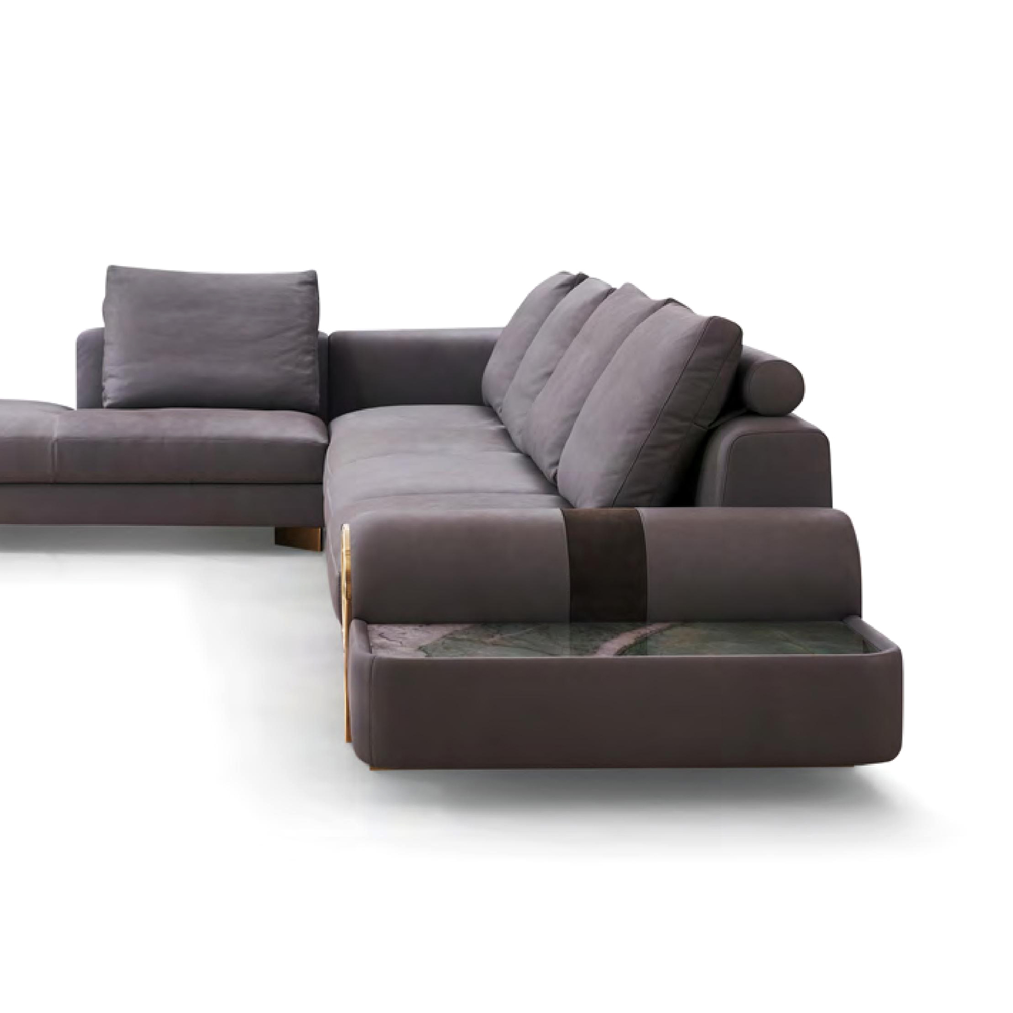 Leather Sectional Sofa – Smoky Grey, Built-In Marble Side Table, Modern Artistic Design