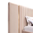 The bed features a tall upholstered headboard wrapped in premium leather, admired for its smooth touch, durability, and rich character. Vertical paneling across the headboard enhances its sculptural lines, while brass inlays add subtle warmth and contrast. These golden accents elevate the design, ensuring the bed stands out as a centerpiece of contemporary luxury.