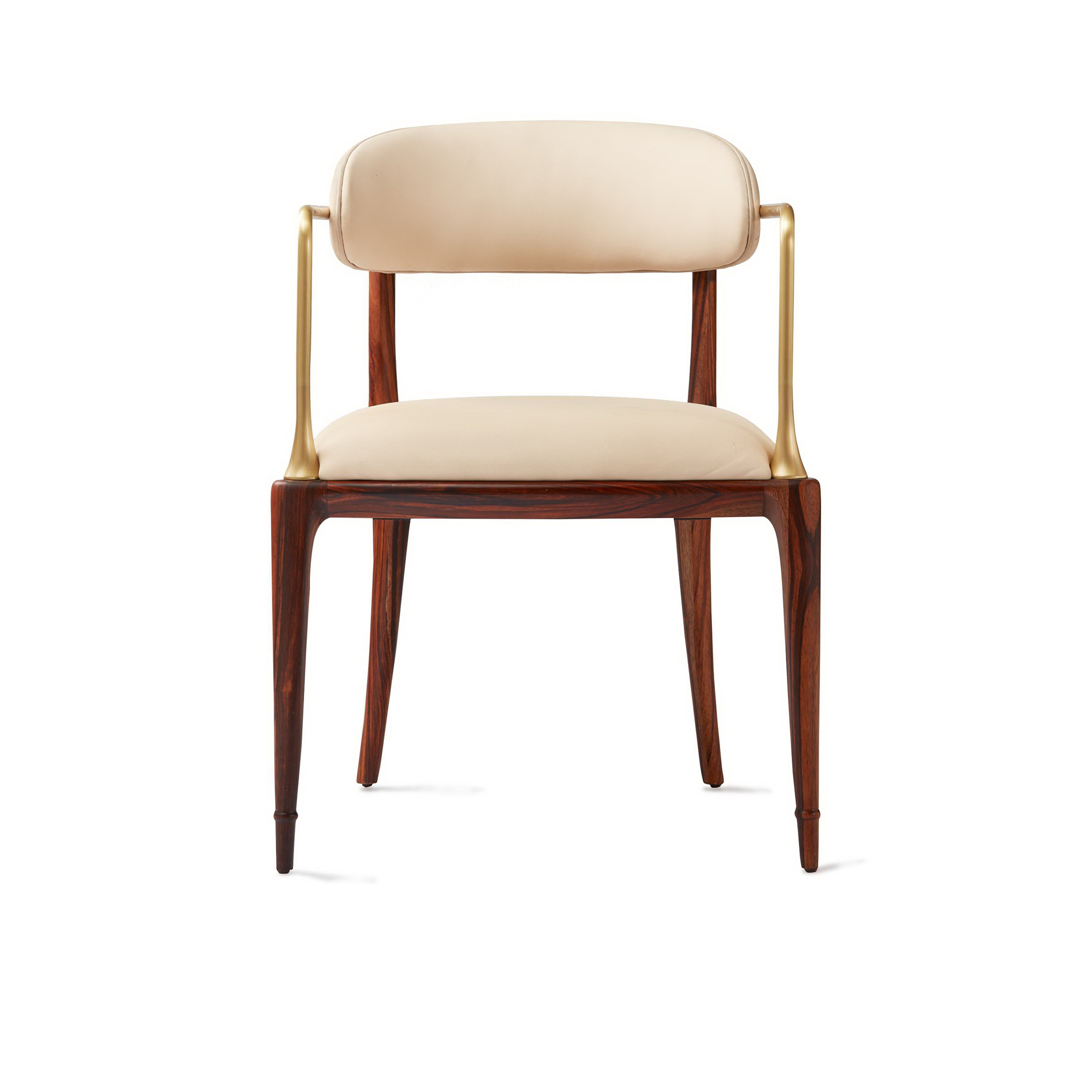 The Luxury Rosewood and Brass Dining Chair is a masterpiece of refined design and exceptional craftsmanship. Its sleek framework is sculpted from premium rosewood, known for its rich grain patterns and lasting durability, while the brass arm accents add a touch of golden brilliance for a modern yet timeless appeal.