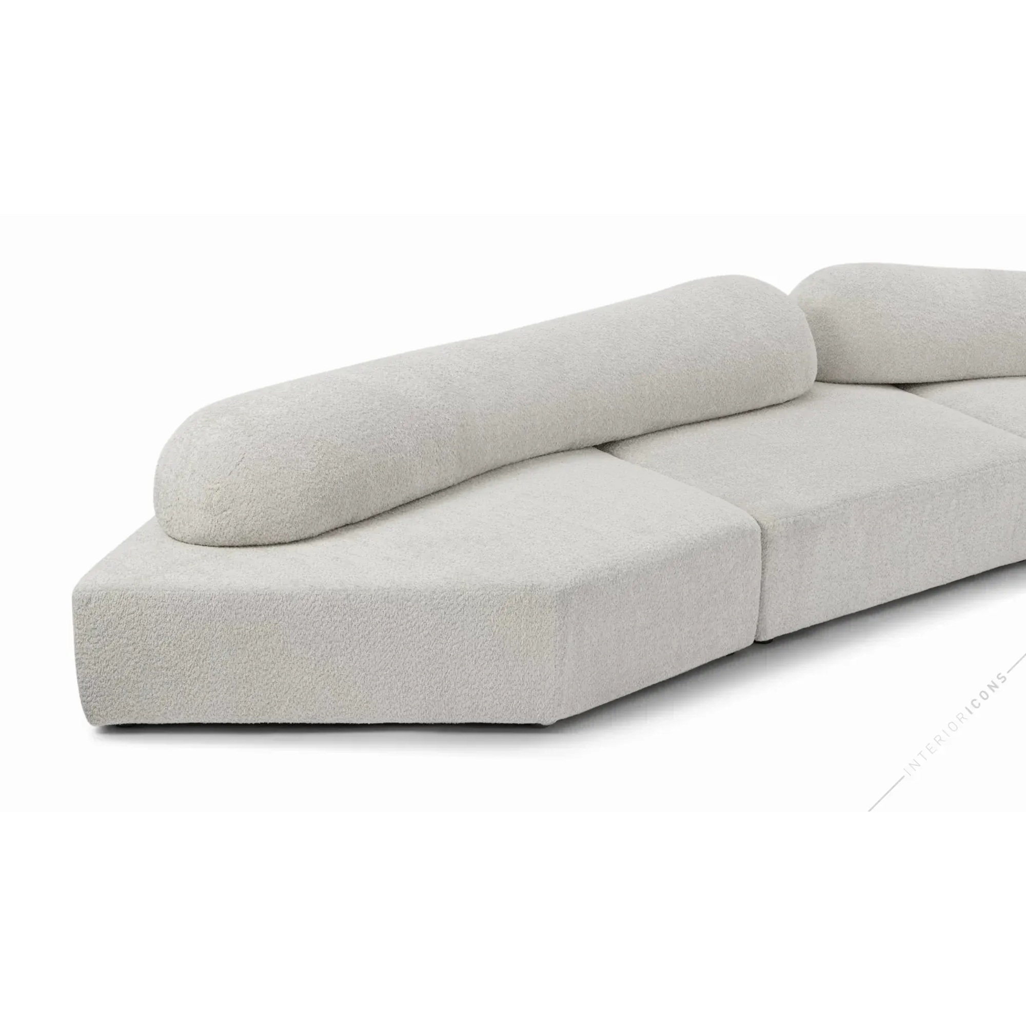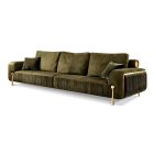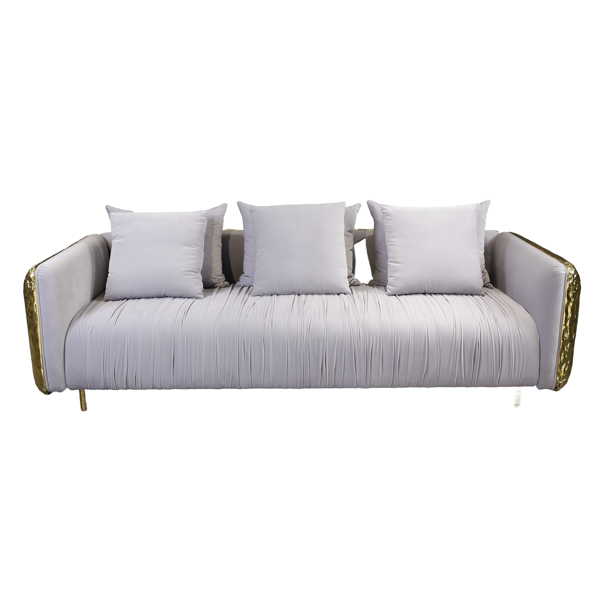 Along the frame, brass lines run seamlessly across the structure, creating a subtle yet striking detail that elevates the design. These golden accents highlight the sofa’s architectural silhouette and emphasize its refined geometry. At the base, slim brass legs provide stability while contributing radiant elegance, perfectly balancing strength and delicacy.