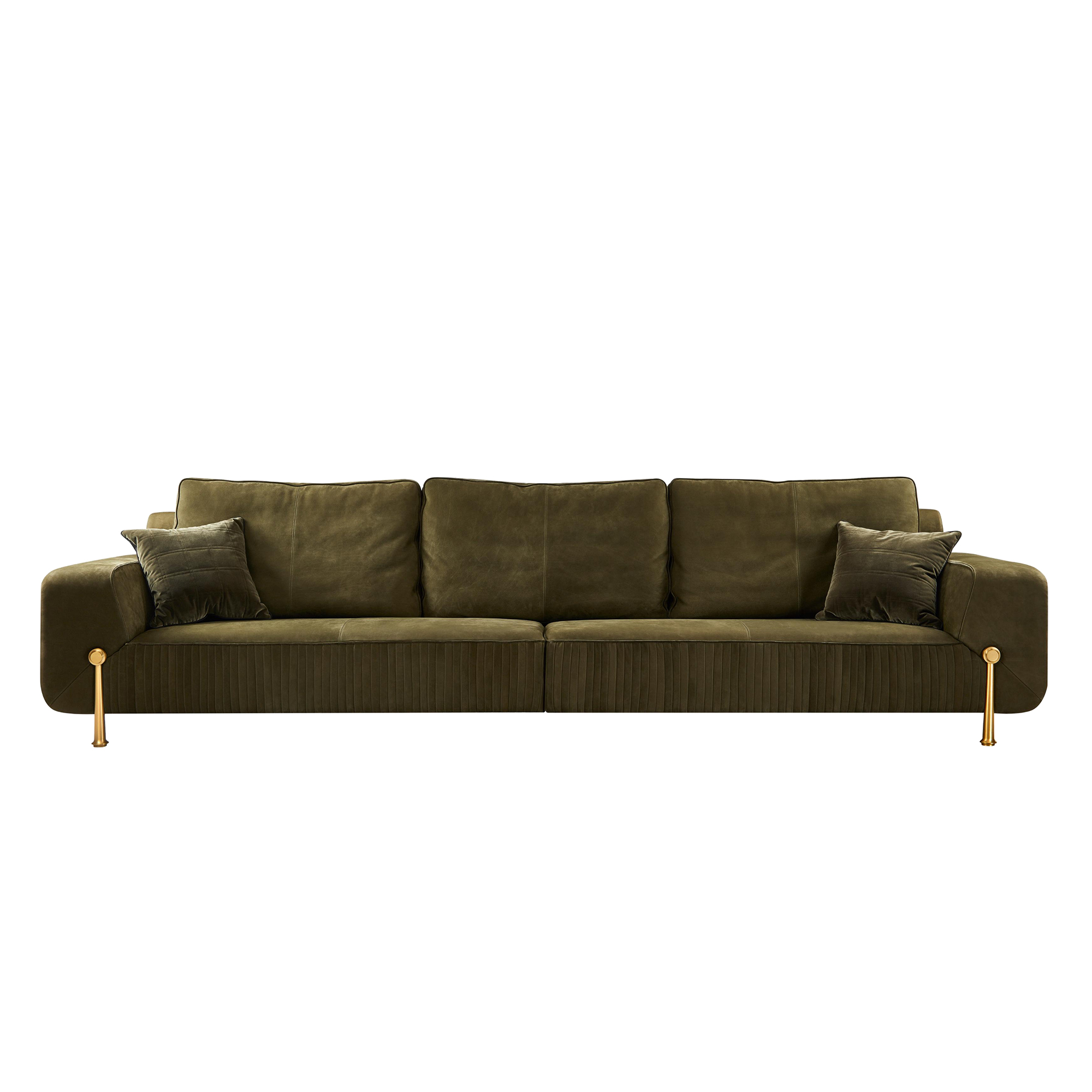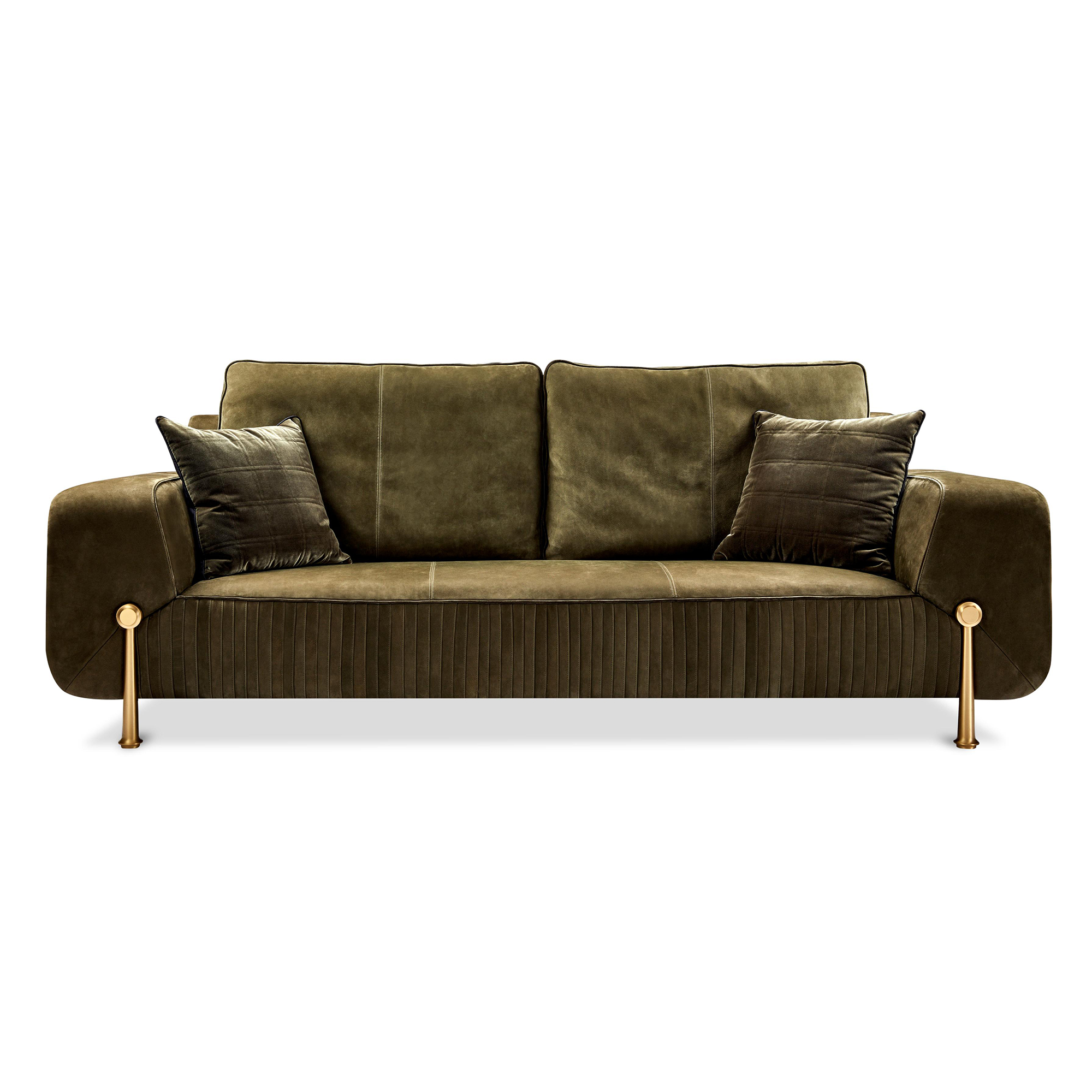 The sofa is upholstered in premium nubuck leather, admired for its velvety touch, refined matte finish, and natural durability. Unlike ordinary leather, nubuck offers a soft texture that enhances comfort while adding a unique sense of luxury. The deep olive tone enriches the piece with warmth and timeless appeal.