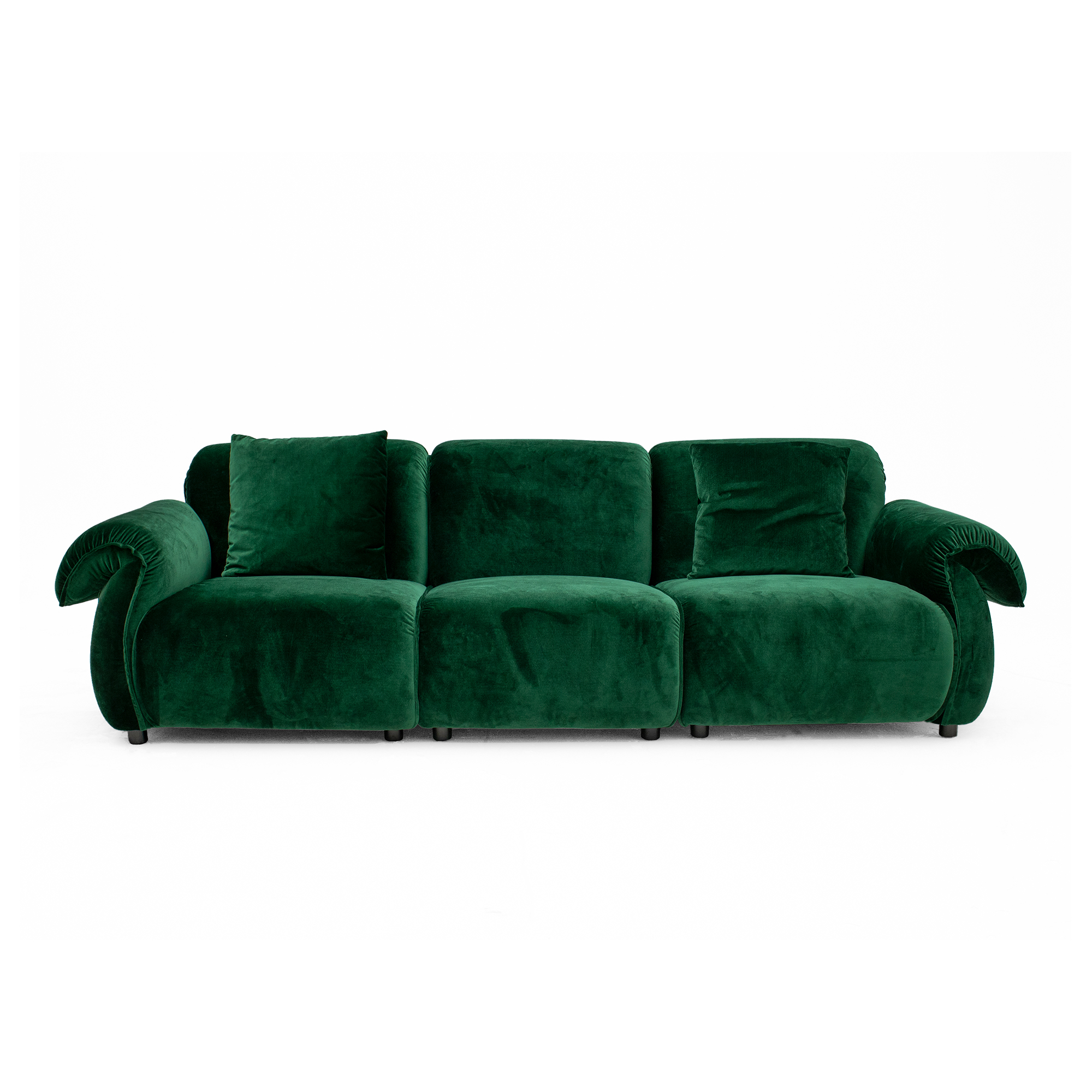 This green velvet sofa brings fresh and lively feeling, like putting a piece of nature into your home. The cushions are soft and full, giving good support when sitting, and the two bolsters in same design make the sofa look simple but tasteful.
